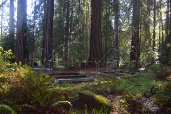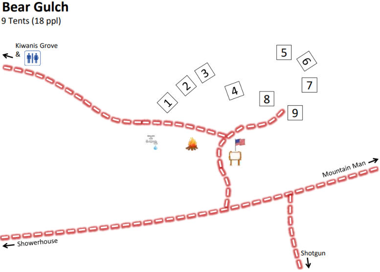 The Bear Gulch Campsite was originally known as Upper Kiwanis Grove and is located across from the shotgun range. During the winter and spring months a small creek runs nearby creating a lush hillside of ferns.